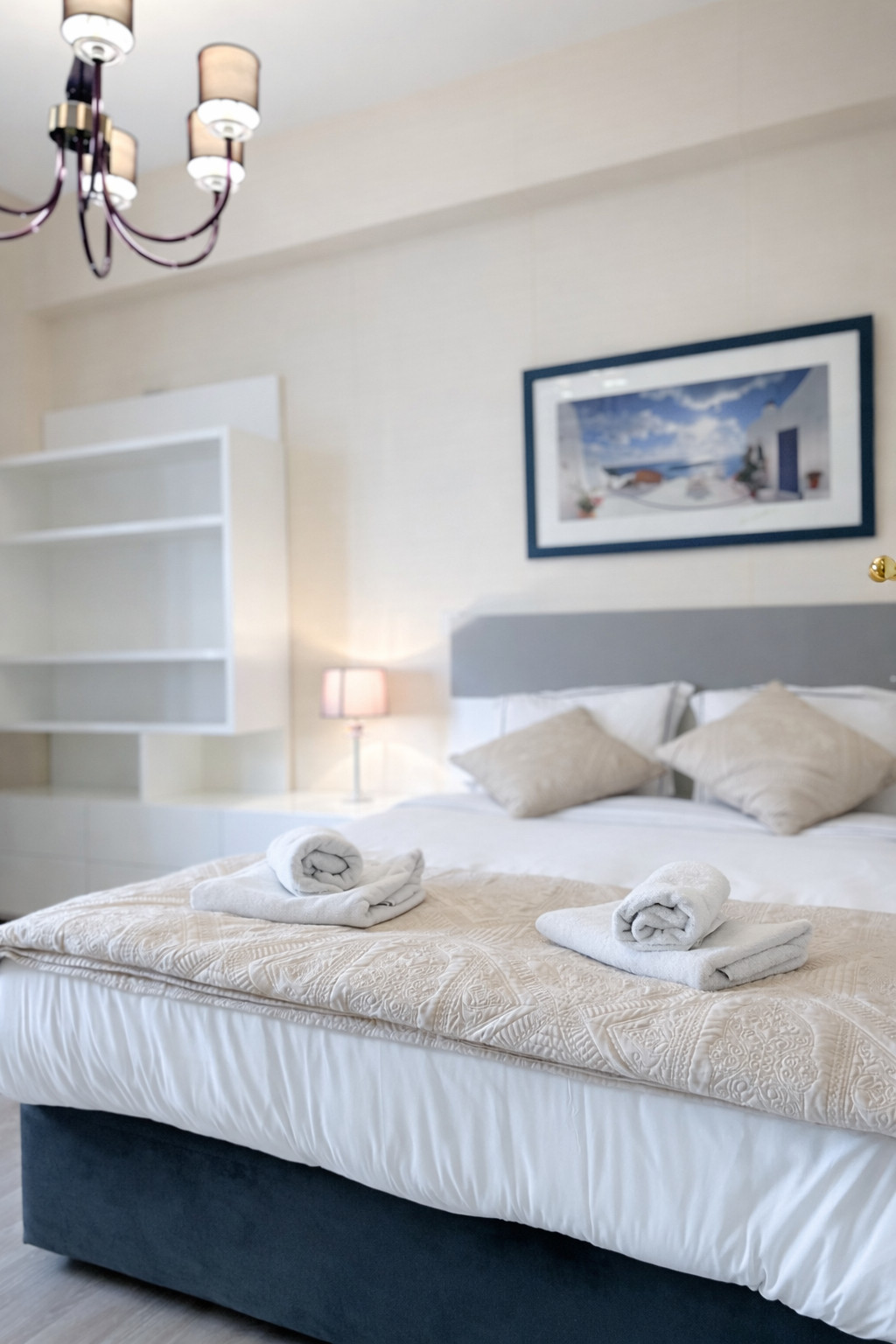The apartment itself has a large private balcony and is literally footsteps away from the beach, the main beach avenue of Limassol, shops, restaurants, bars, cafes, etc. A fully equipped air-conditioned apartment with an open plan living, dining, and kitchen area. The master bedroom has a king sized bed, a walk-in wardrobe, and an ensuite bathroom with a shower. The other 2 bedrooms have a queen-sized bed.